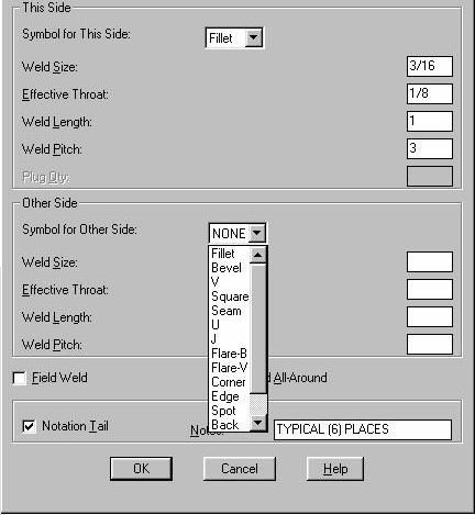 A dialog box displays each of the available symbols is shown at the top for reference. You can select a weld symbol and dimensions as is appropriate for "This Side", the "Other Side" or both. If Plug is selected for the "This Side" weld, the unnecessary dimensions and the "Other Side" will be disabled.